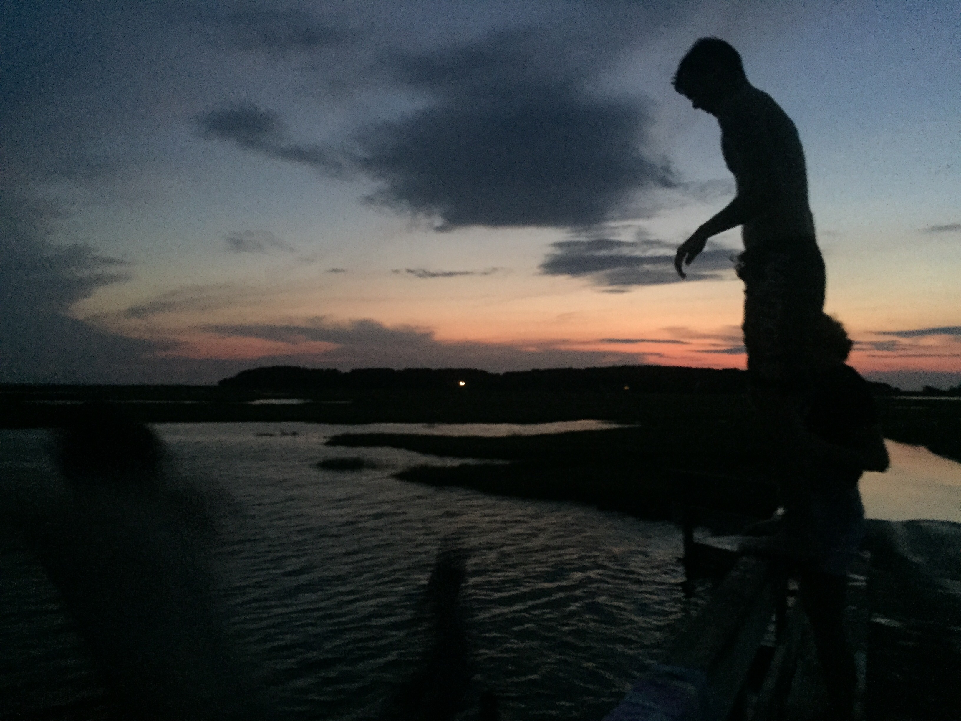 Tonight we laughed under a sky filled with shadows and ever changing bands of purple and fuchsia. As the sun set in the west, I waded through the tide to reach the bridge so I could witness (and cheer on) the daredevil feats of 4 boys. It was a magical evening.