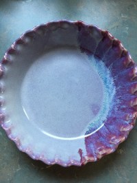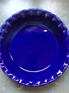It turned out that there was an outlet nearby where Bruning sold their pottery seconds. You know, stuff that might not have turned out as perfectly as planned, yet still was lovely and useful. I came back east with a couple of pieces and an undying love for their work. Over the years the collection has grown (we eventually had dinner service for 6 or 8), divided (divorce) and diminished (breakage), but there was one steadfast piece that I retained and used regularly for making quiche and pies and serving, a deep blue dish that I absolutely loved.
