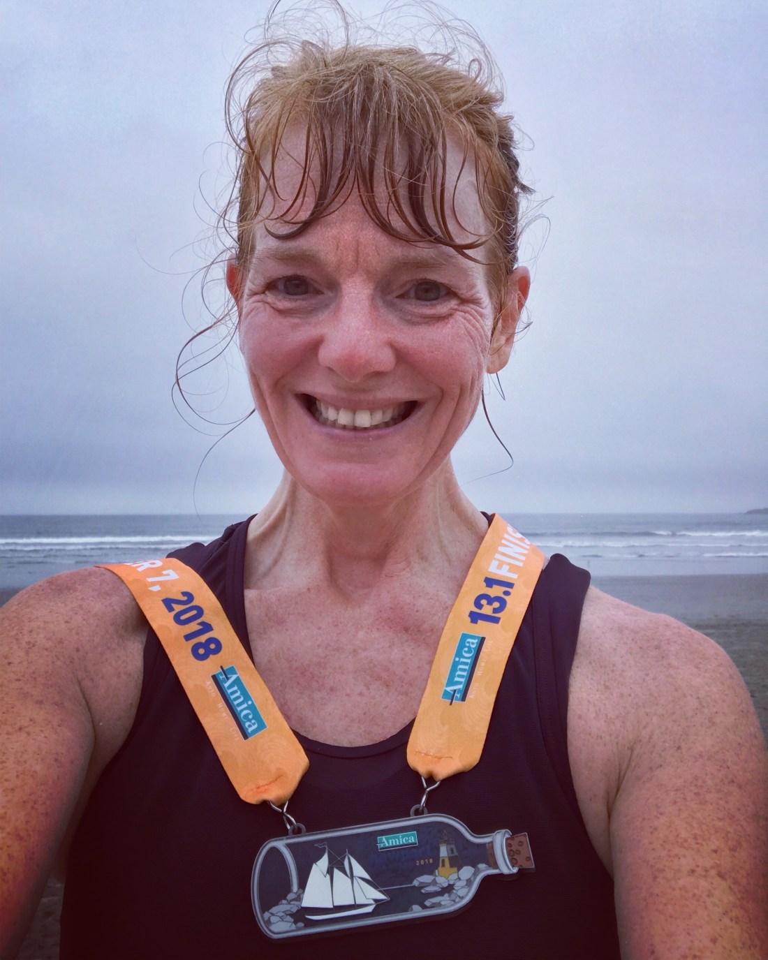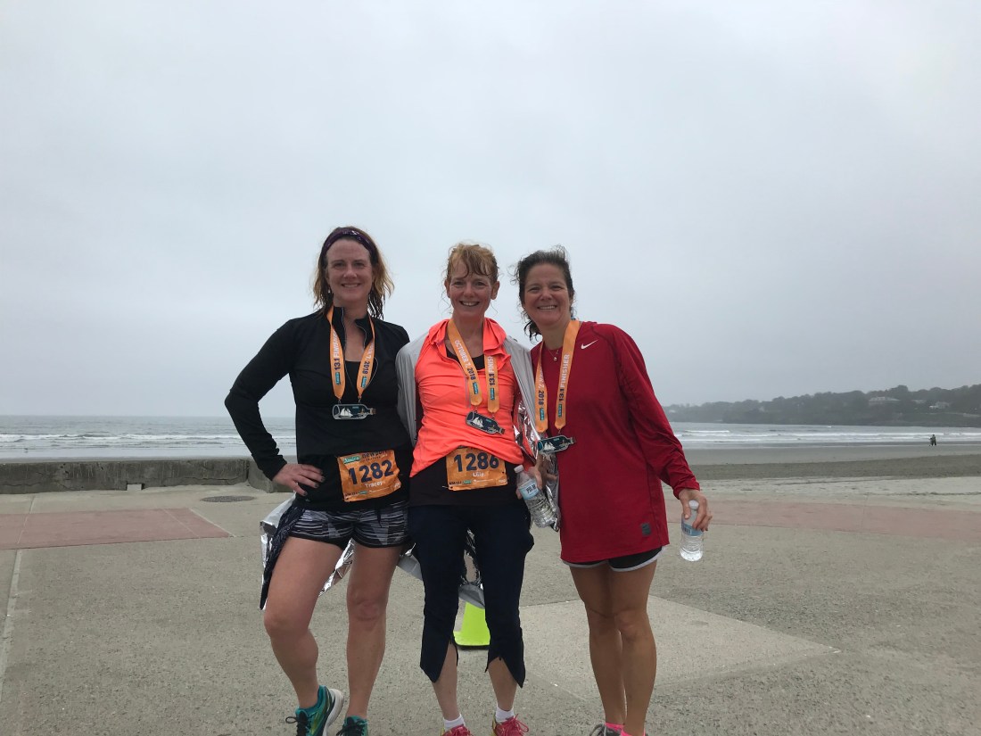 Following a great dinner at home of Cardona’s takeout brought from Albany, and an early night, we were back at the beach Sunday morning 30 minutes before our 7:30 a.m. start time. We had been warned about large crowds and closed roads, but had no issue getting dropped off in a convenient location – good job, JT. Portapotty lines were long, but we managed a quick bathroom visit prior to lining up at the start, optimistically with the 2:20 wave. My half marathon times range from 2:22 – 2:28, but I was hoping to break 2:20 for my first time. Goals are good, right?