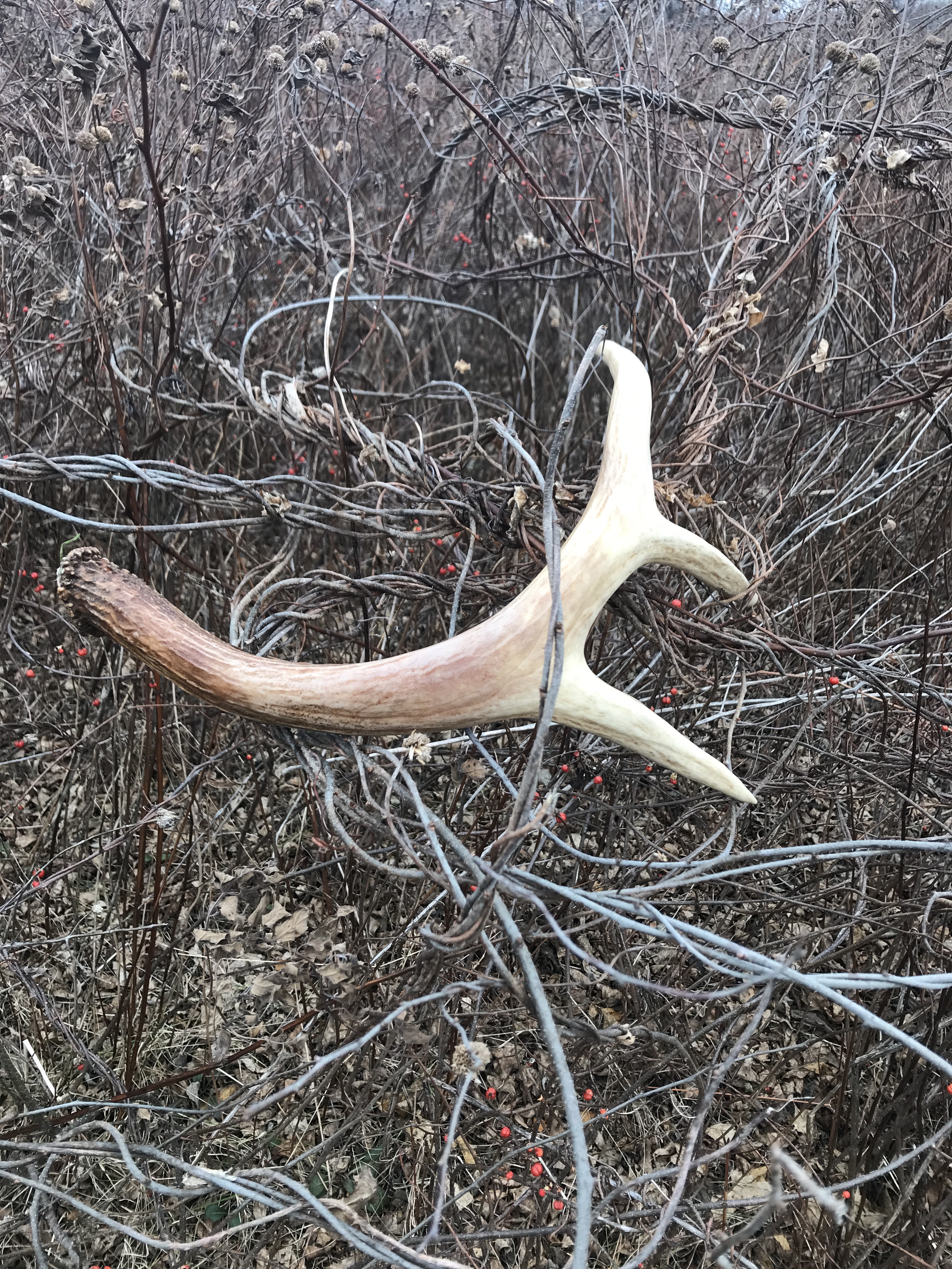 On Sunday I took a walk at the golf course and found the most fantastic piece of deer “shed.” It was lying in the meadow, completely exposed and bleached white, a four-point rack from a buck. I could scarcely believe it was just there in grass, there where no one else had seen or taken it. I picked it up, surprised by the smoothness, and accepted it as a gift from the universe. You know, because that’s the kind of relationship the universe and I have.