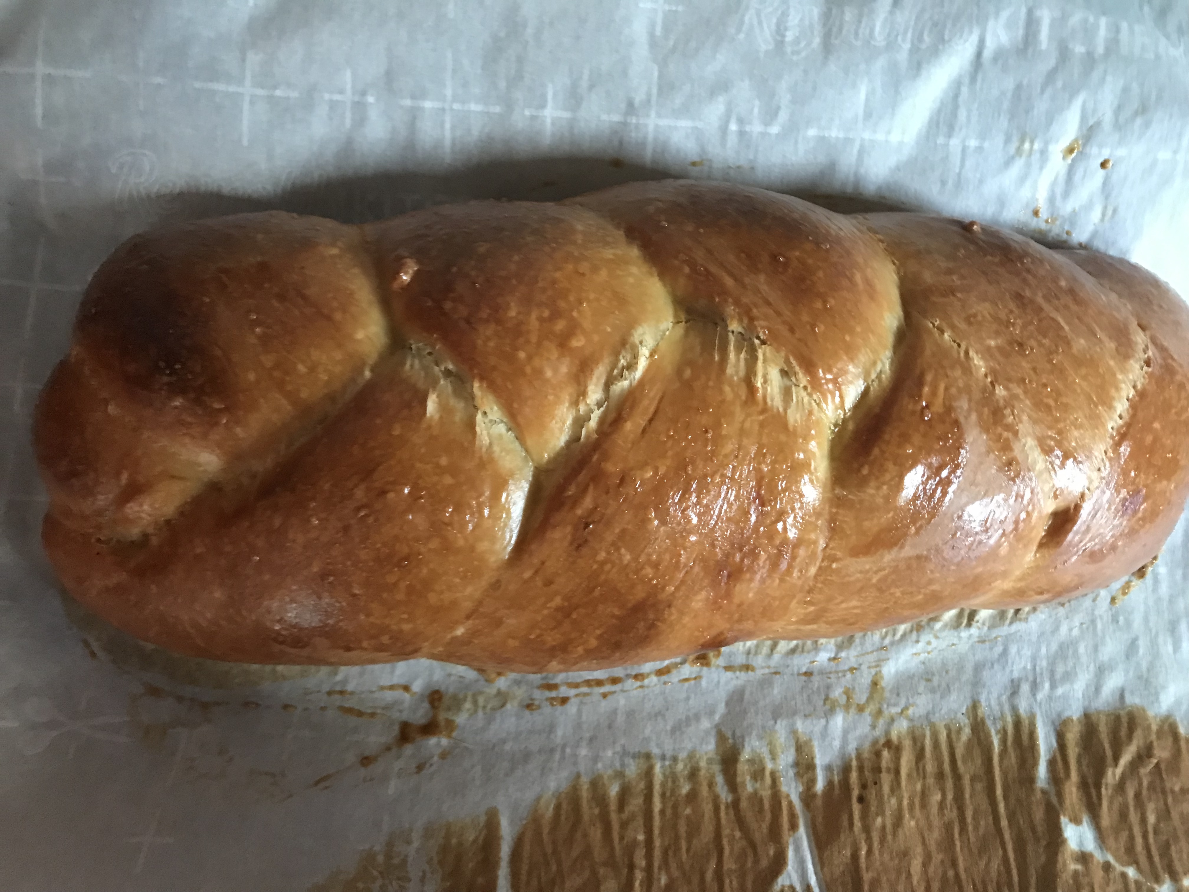 About 3 hours later, I brushed the dough with the recommended beaten egg with a pinch of salt and popped the loaves into a preheated oven. They baked for about 34 minutes and I moved them around the oven a total of three times during the process. I think they’re beautiful, but the taste is kind of bland. I’m going to try them again with freshly purchased yeast, another egg and a touch of honey. I’ll let you know how it goes.