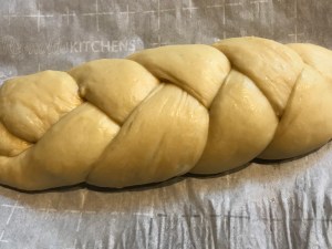 About 3 hours later I checked the covered-in-plastic dough and saw some expansion, but not much. I handled the dough a bit and divided it into portions which I hoped to braid together prettily. That part went really well. Once the dough was shaped, it got covered and I placed it in the fridge for overnight. “Overnight” is such a non descriptive word really. This particular night, it meant taking the dough out and placing it on the counter at about 4:00 a.m. I miss sleep, but there’s always something with which to occupy one’s time.