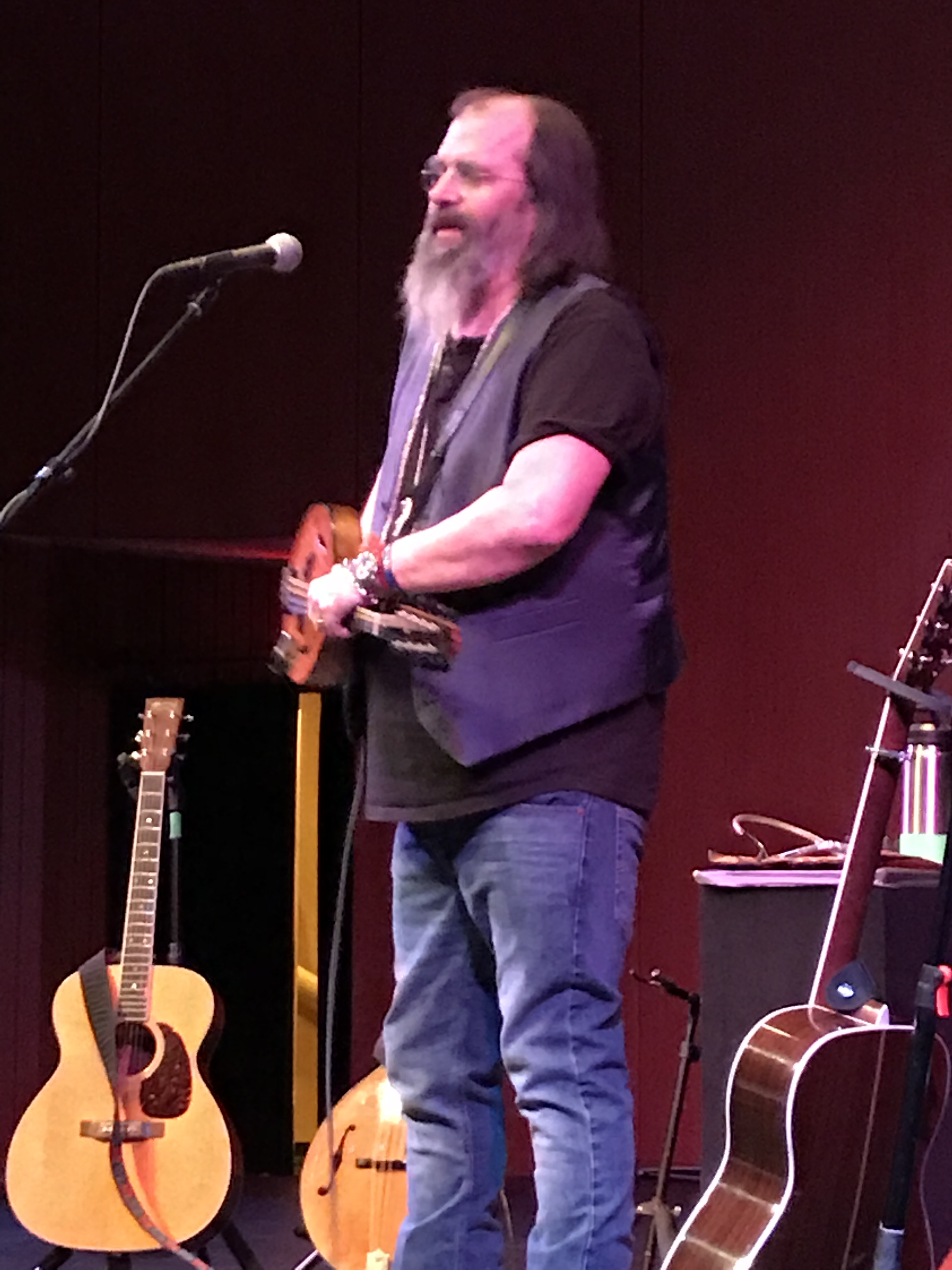 As for the headliner, Steve Earle did not disappoint. The “tools” of his trade, 6 various stringed instruments, were arranged around him like a womb and he played each of them with incredible technical skill and respect. His prowess reminded me of Richard Thompson, in a way. But, when I hear Thompson I can’t help but look for the other guitar player who surely most be playing simultaneously, because one guitar player can’t possibly create that much sound. When it came to Earle, though, my eyes were seeking the additional musicians who had to be contributing to the sound with instruments beyond this one single guitar. He just made so much music! Genius comes in many flavors, friends.
