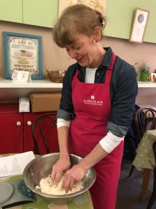 I arrived and easily located her cafe upstairs. Within minutes, I had an apron on and was reading through the recipes which she handily provided. We elected to make half batches of the recipes since I would be taking the goods with me and certainly couldn’t eat more than 6 scones and a loaf of bread over the next few days by myself. We began with the scones, weighing the flour rather than measuring by volume. Side note: I think I need a kitchen scale. After using my hands to gently mix the dry ingredients, Kate asked my preference for cranberries or raisins (the former was my pick) and tossed in a casual handful of full, frozen cranberries. Next in was a combination of cream and beaten egg, lightly mixed in with a wooden spoon. The dough was slightly wet, but when turned out onto a floured surface, it firmed up nicely. I formed a 2” or so thick rectangle of the dough and used a glass to cut my circles, which went onto a baking sheet after a quick brush with the remaining milk/egg mixture. They came out gorgeous and fabulously light. Delicious.