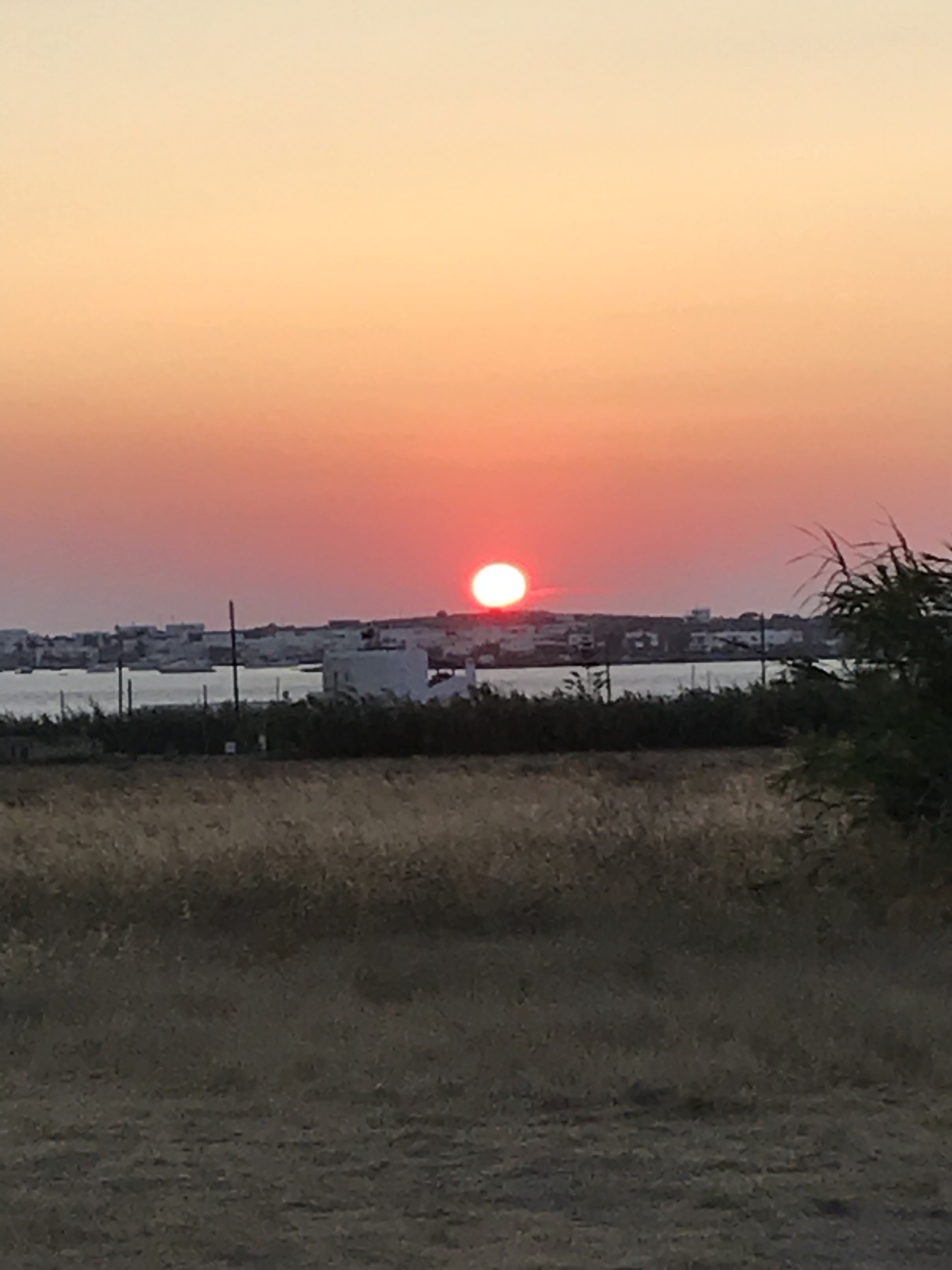 Paros is simply lovely. It isn’t as hilly along the port as the other two islands and I can almost imagine actually taking a run here, if I were an early morning runner, that is. The beach we went to yesterday was great and a deal (10 euro for two sun beds and an umbrella) compared to Mykonos where the same set up would have cost 26 euro. The buses are frequent and cheap and will get us where we want to go today – the beach again, followed by the Byzantine Trail for a hike. Our airbnb experience last night, a farm to table meal, was fantastic (more details to follow) and the bakery around the corner is completely responsible for my rounded belly courtesy of their delicious pastry.