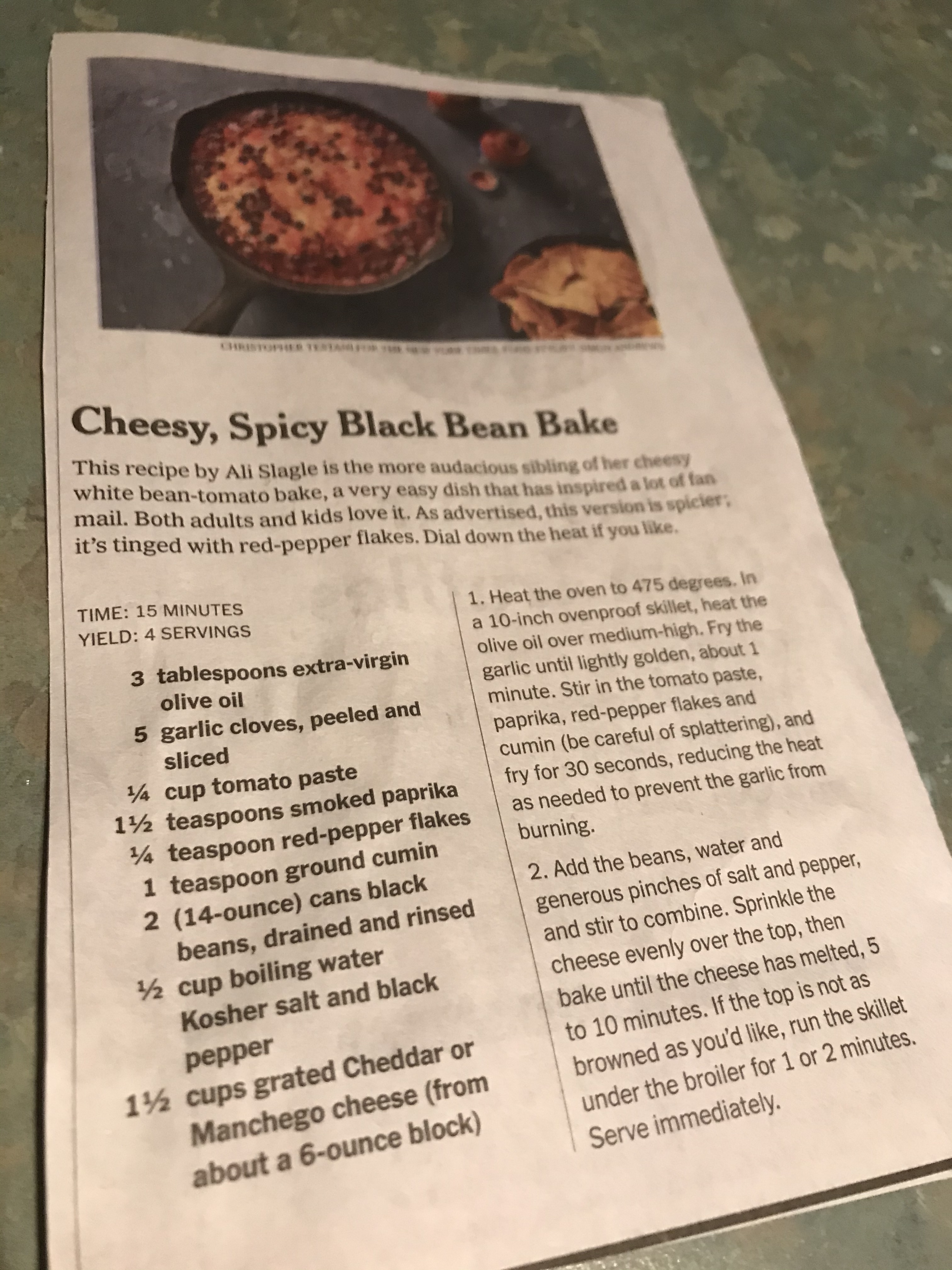 If you’re looking for a fast and delicious meal from your pantry, I’ve got just the thing – Cheesy, Spicy Black Bean Bake! Perfect for Meatless Monday or any other time you want something reasonably healthy and quick. The recipe is another winner from the NYT and I bet you have all of the ingredients in your house right now. Unlike me who had to borrow a hunk of cheddar from my ex.