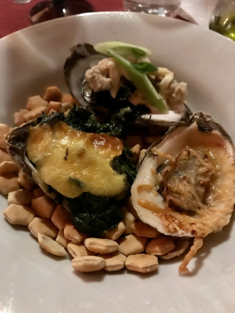 I was remiss in documenting the entire meal, but I can say with enthusiasm, that our dinner, served in 5 courses, was truly outstanding. From the opener of the oysters served as a three way (ménage a trois, peut être?) to the delightful fried artichokes served with a bright aioli and briny capers and the most simple salad of thick stalks of asparagus and perfectly cooked and chilled shrimp, I felt absolutely transported.