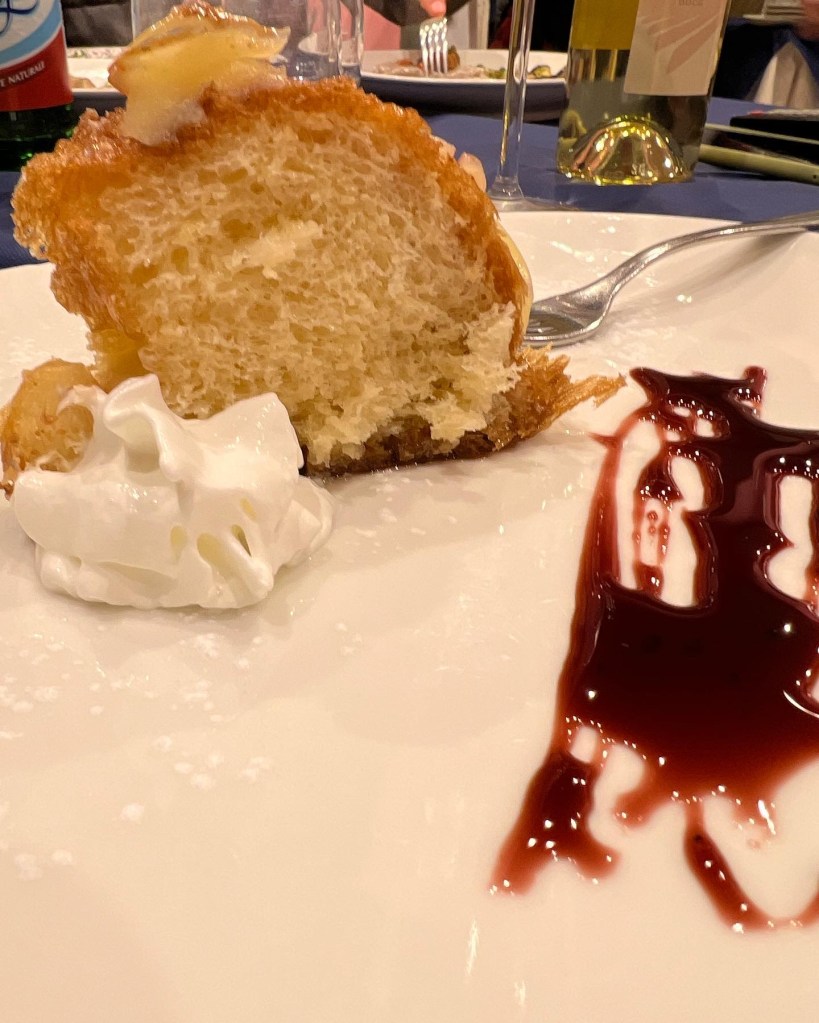 I followed my pasta with a local dolce specialty, babà cake. This rum soaked cake served with whipped cream and a smear of wild blueberry sauce was absolutely lovely and made for a wonderful way to punctuate what was an incredibly satisfying dining experience.