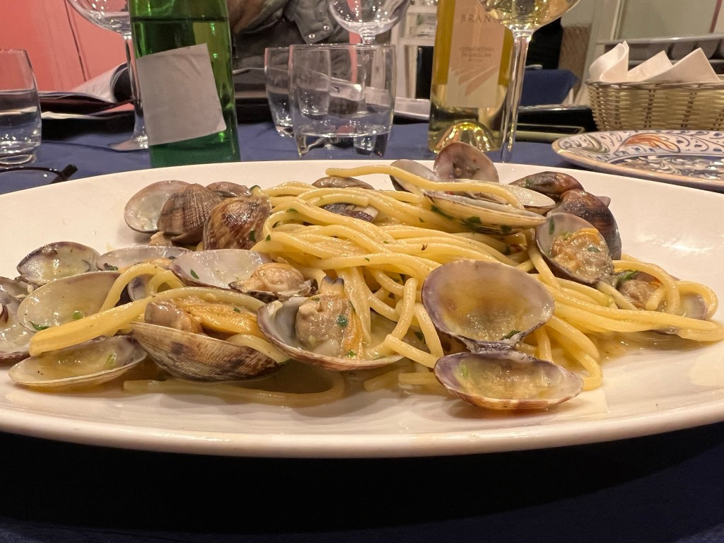 The couple who joined me for dinner were also tourists, from Israel. They were lovely, spoke terrific English, and we enjoyed lively conversation about an array of topics during the meal. My main course arrived and it was undoubtedly the best spaghetti with clams that I’ve ever eaten. The pasta was cooked al dente and topped with a generous serving of small, sweet clams. Absolutely dynamite.