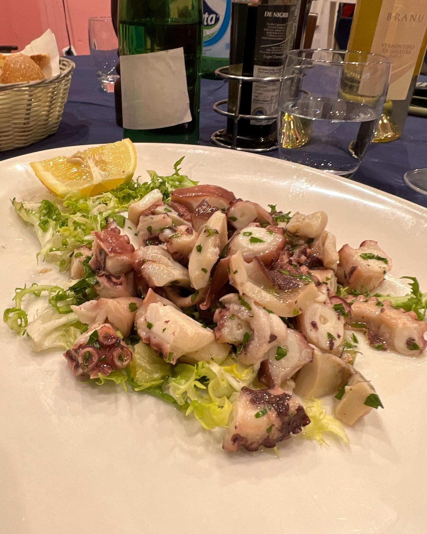 I settled in with a menu and some information about availability of specific items and quickly made a couple of decisions – octopus salad followed by spaghetti with clams. When I voiced my choices, my server gave me a respectful nod and asked what I might like to drink with my meal. Without consulting a wine list, I asked for a glass of Vermentino, a selection with which he also seemed to approve.