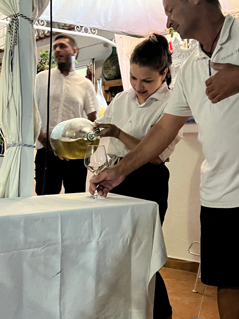 Our reward for being game was a generous pour from a huge jug of their own local wine into a third wine glass now on our table. I politely took a sip and found it to be, shall I say, rustic. Not undrinkable, just a little more astringent than I prefer. I returned to my own glass from our purchased bottle for a chaser, draining the glass. The observant Neptune noticed my empty glass and helpfully removed it, leaving me with only the quite full glass of his house wine. Not daring to ask for another glass, N and I shared his glass.