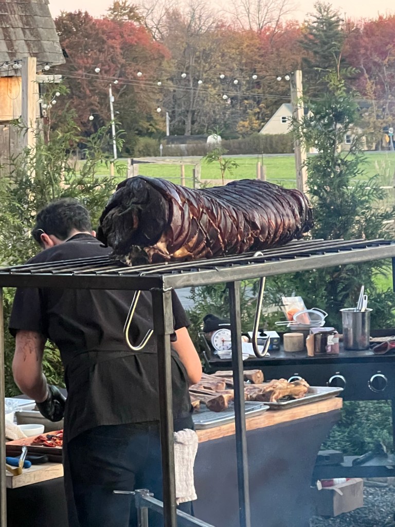 In terms of cooking, the action was just beyond the doors to the barn with multiple wood fueled fires providing tantalizing aromas. We were welcomed with beverages, with featured options of negronis and cider being offered, along with passed small bites, both of which we sampled repeatedly. The mousse was outstanding, served on a tartlet crust that was hard to completely identify, but even more difficult to resist. So good!