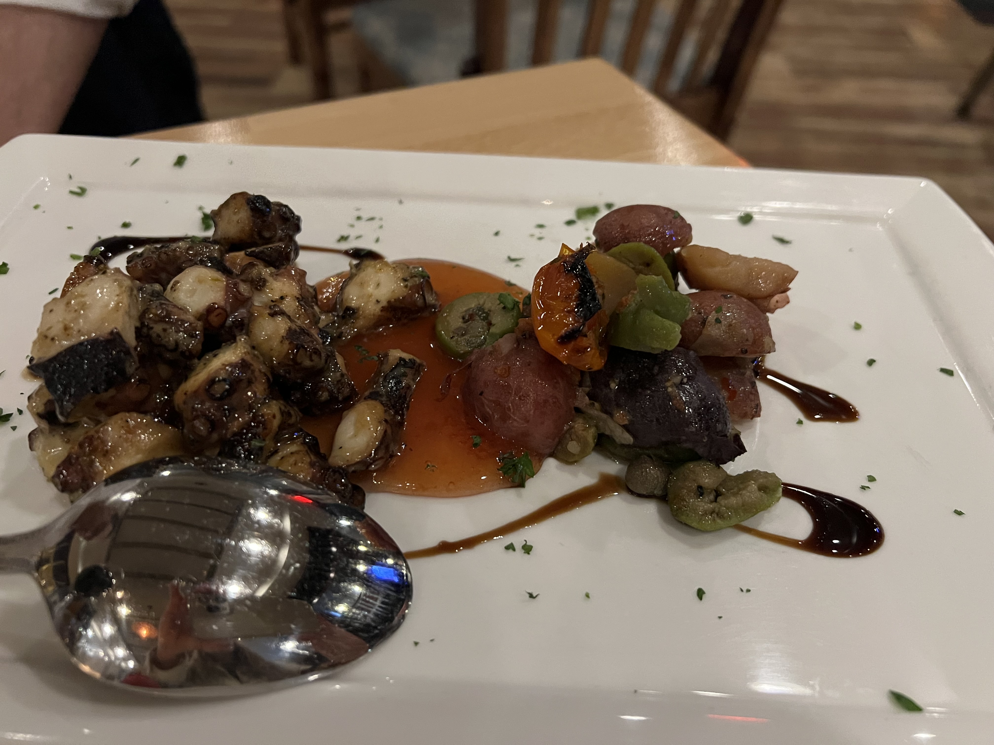 Our next plate was a really interestingly composed grilled octopus dish served with a salad of potato chunks and green olives with a tomato jam. I liked it, but the octopus was a tad overcooked, not enough to make it chewy necessarily, it just wasn’t as tender as it could have been.