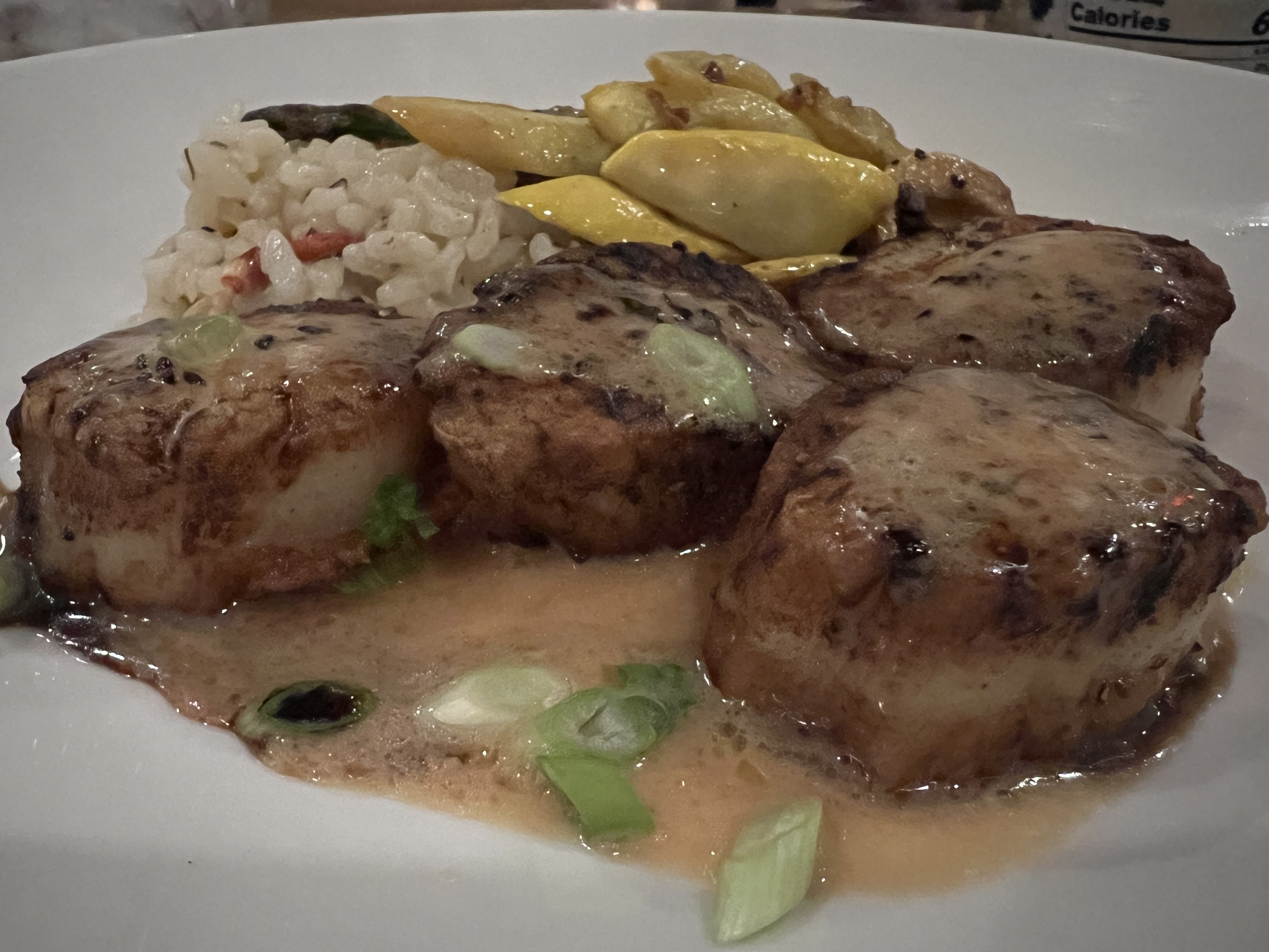Because we’re eaters, and we wanted to try as many different dishes as possible, we carried on. I had perfectly cooked and gorgeous sea scallops. They were joined on the plate by a lobster risotto and sautéed squash, making for a complete entree. Like I mentioned, the scallops were lovely. My only minor complaint was a bit of char on their exterior which wasn’t so much a searing as it was perhaps, the remnants of the grill on which they had been cooked. Still, a really nice dish – and the fish was undoubtedly very high quality.