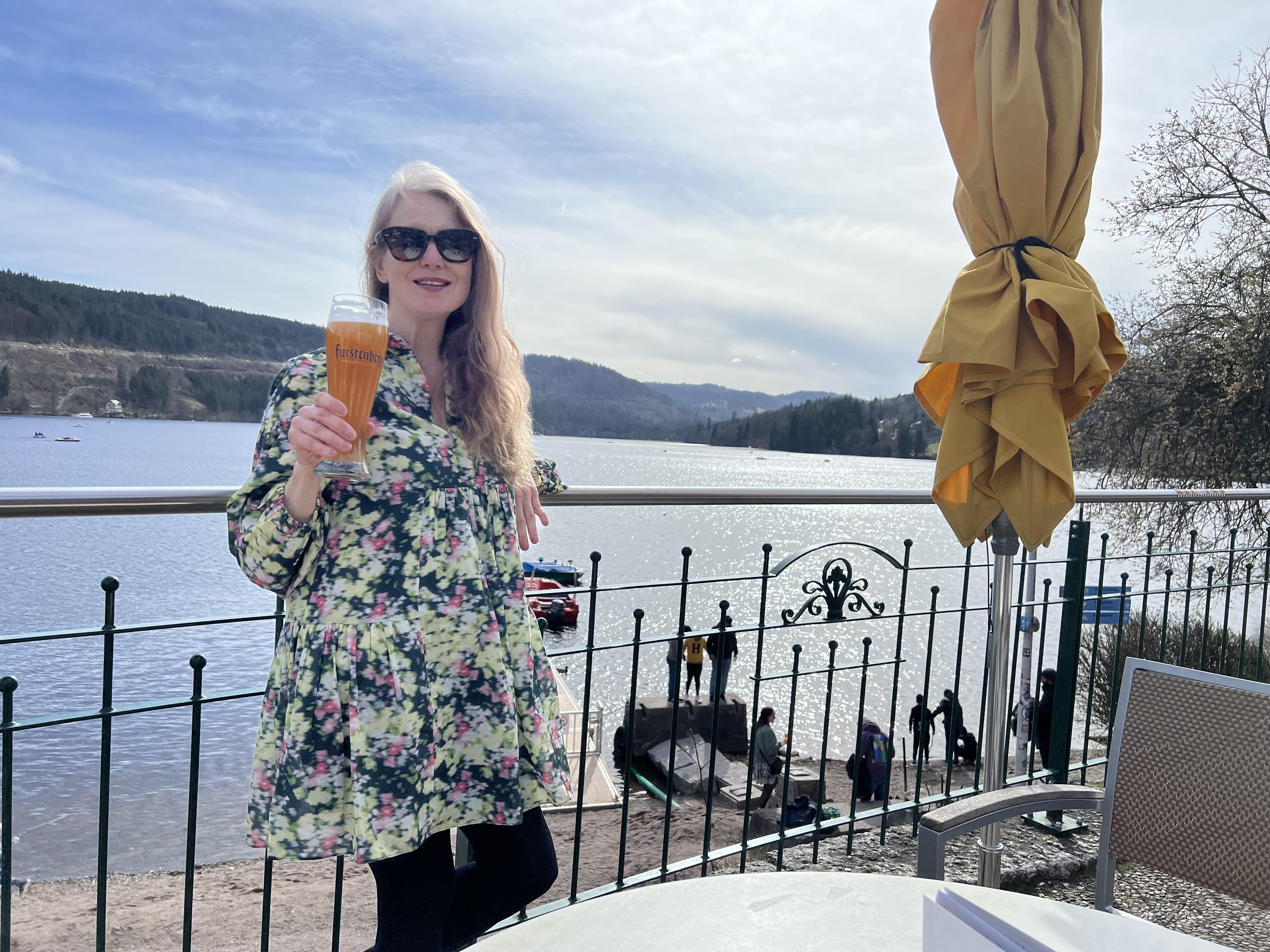 We had dinner reservations with my family at 6:00 at a pizza place in Neustadt, a short train ride away. Along the way, I planned a stop in Titisee for a walk and to show N what I’ve come to think of as the Black Forest’s much cuter version of Lake George. Although the morning skies in Freiburg were foggy, the afternoon forecast predicted brightening skies and we were met with bright sunshine when we got off the train 45 minutes after boarding.