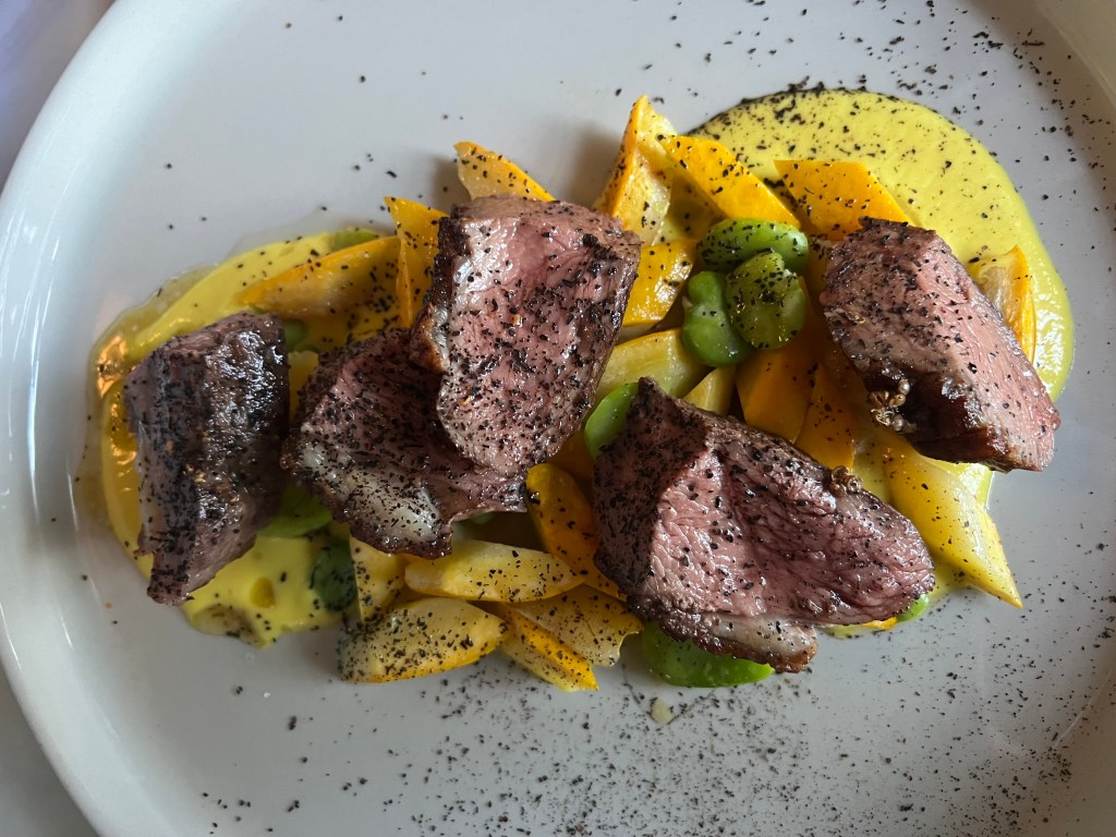 It was our first time checking this place out and it looked pretty impressive, albeit a little confusing. The accommodations seem to be oriented so that the front, parking lot facing rooms are designed to maximize privacy and minimize noise from the road. The Lodge, where live music is offered along with lighter fare, is on the south end while the restaurant is on the northern side. Behind the motel there is a pool and some pockets of seating, all facing greenery. It’s cool – and pet friendly. We met a couple of sweet pups who seemed to be enjoying the setting just as much as their people.