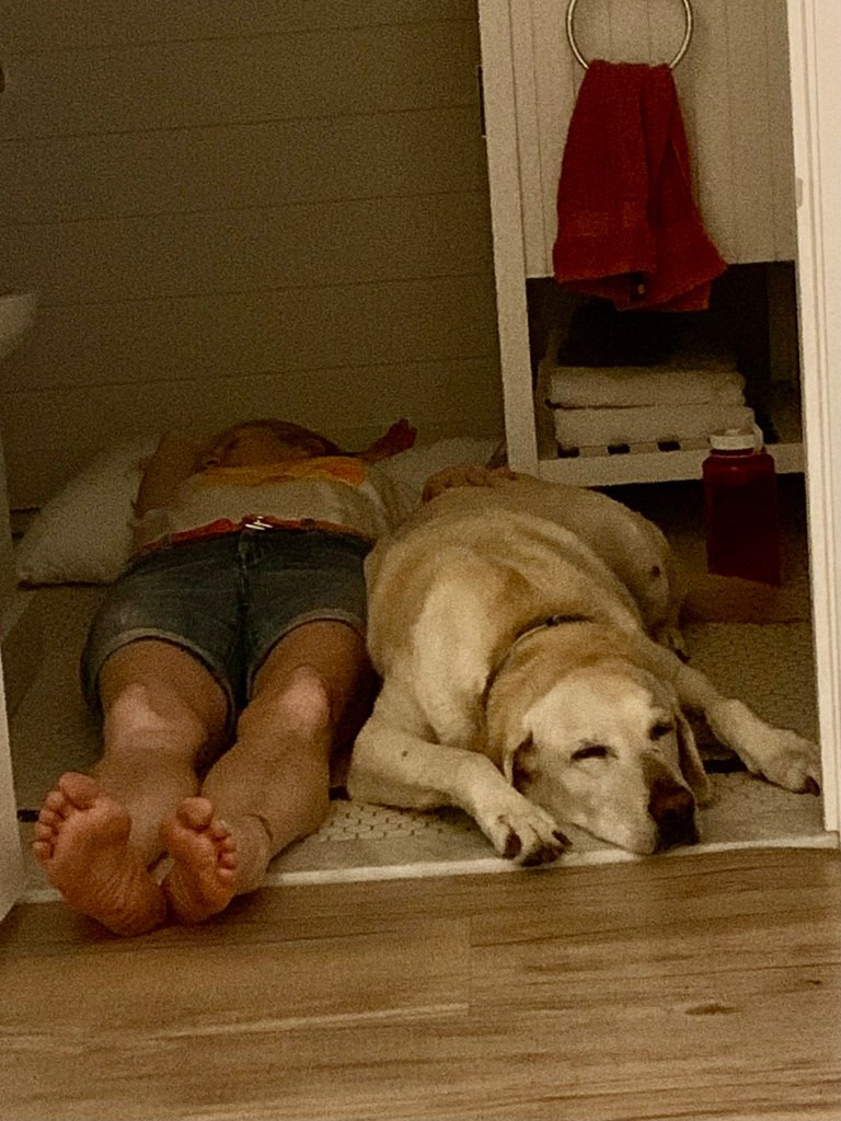 Our first night on the Cape, something I ingested disagreed with me and I found myself on the bathroom floor for a bit of time. While I was aware of that, even as it occurred, what I didn’t realize until I saw the photo below was that Jeter had nestled into my side and sprawled out on the bathroom floor with me. Today, a delightful beach day without flies, he spooned me in the sand.