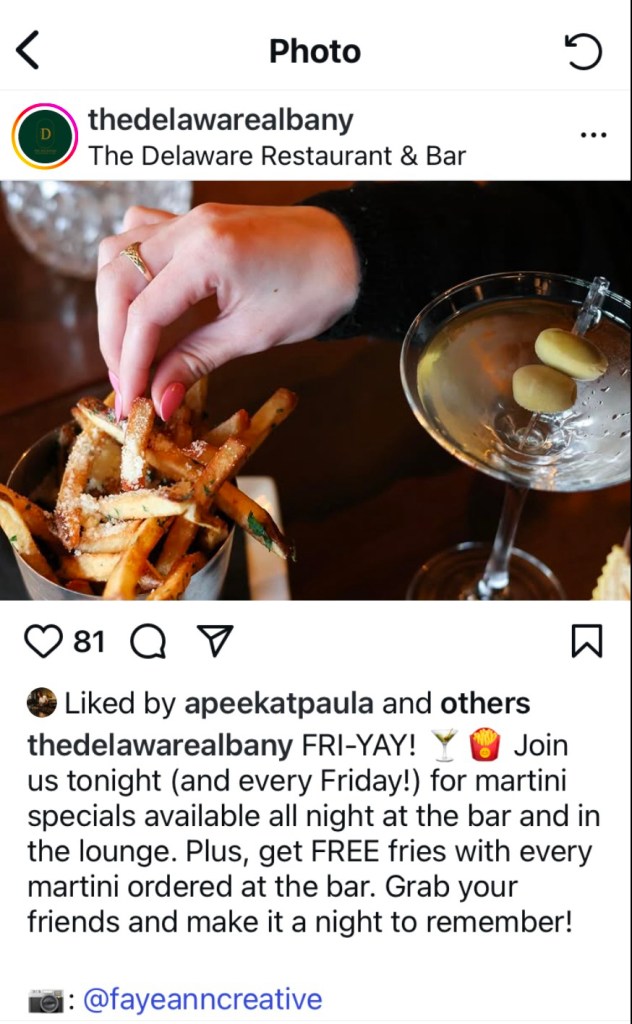 Another special night of the week is Friday, or as The Delaware calls it, Fri-yay. That’s the night when a martini, with piping hot French fries on the side, will set you back only a ten-spot. Can you say “girl dinner?”