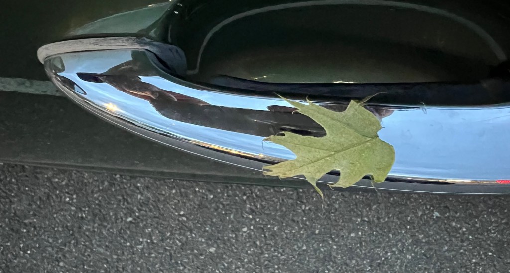 The first morning I woke after having decided the time is right to retire, this perfect little leaf was stuck on my car door handle. It was there the entire day.