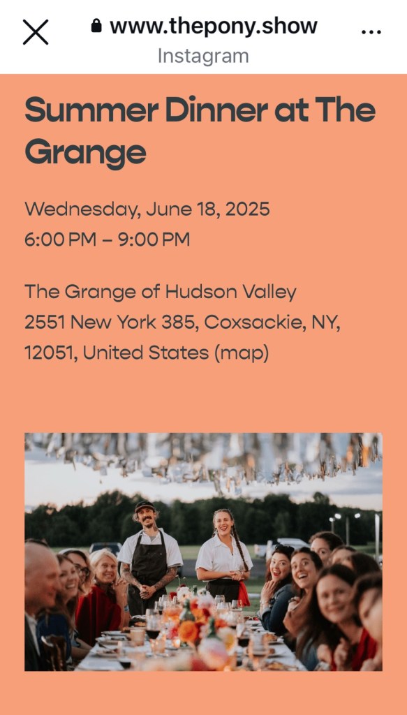 • The Pony Show at The Grange. There will be no better place to be on June 18th than at this gorgeous Greene County spot watching the sun set over the pristine Catskill Mountains with a plate of locally sourced and deftly prepared ingredients. The last one of these we caught was outstanding and I have no doubt that this almost summer event will be on the same level.