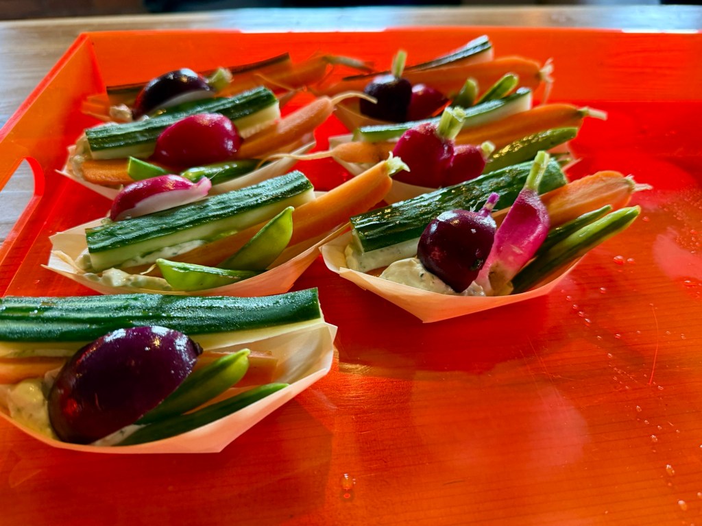 The night began with a signature cocktail and beautifully presented individual crudite trays to snack on. I’ve never developed an appreciation for gin, but this cocktail focused more on herbaceous and citrus than gin. It was a great taste bud stimulator and, I have to confess, I drank two of them while we chatted with friends we had been pleasantly surprised to run into.