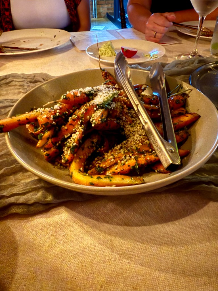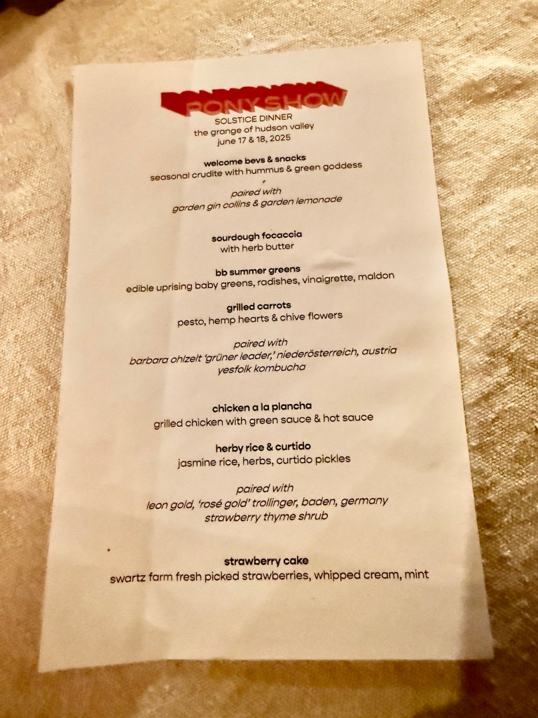 We picked a couple of seats at the long table inside the barn and settled in. The menu was an ode to early summer with local produce in the starring role. Edible Uprising greens, paired with a pillowy focaccia that demanded the diner to take a second piece, were bright and paired beautifully with the Austrian grüner. Gorgeous grilled carrots were a perfect union of earthy sweetness. We left not a single one behind.