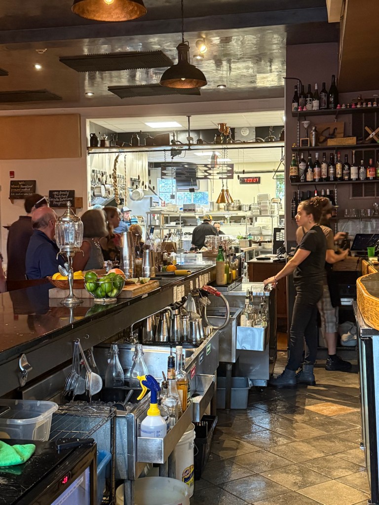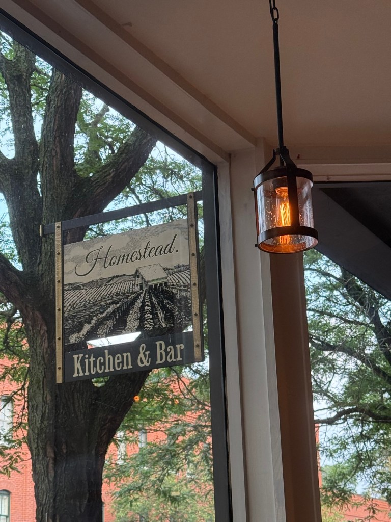 Homestead Restaurant. I first noticed this terrific restaurant on my way to the yoga study. The day was overcast and the restaurant was dark on this late afternoon. I peeked in the window and noted the L-shaped bar, open kitchen and warm, but minimal, decor. It looked like my kind of place.