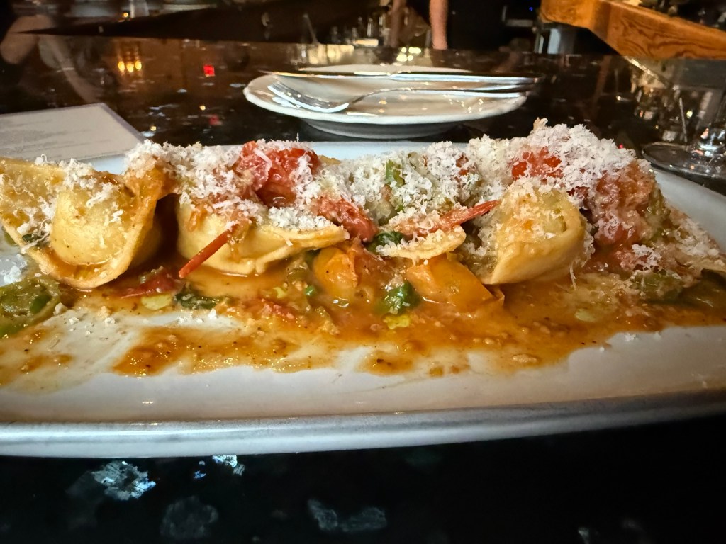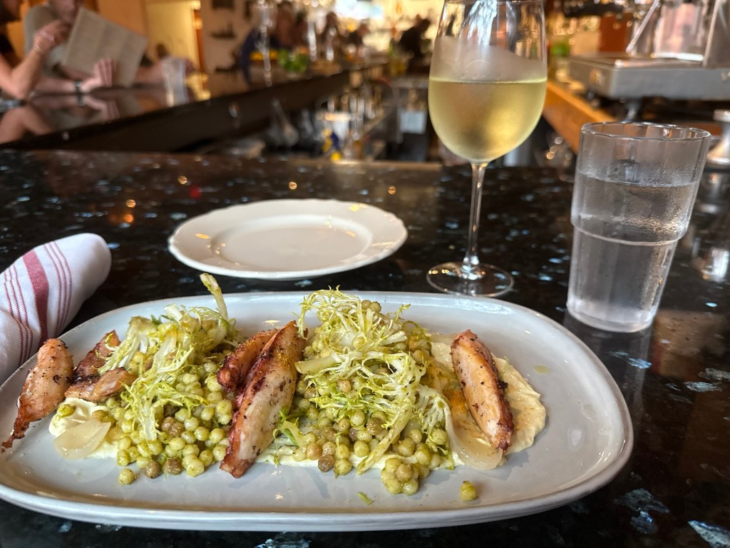 A few hours later, post yoga and shower, I took a seat at the bar and settled in with a menu. Eventually, I selected an octopus small plate, followed by ricotta and corn stuffed tortelloni, house made.