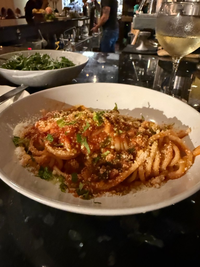 I didn’t realize it at the time, but every dinner after this one, would be a step down. Except for my evening meal on Thursday, my last night in town. That’s because I went back to Homestead and appreciated the Caesar salad and bucatini I was served even more after having had a couple of dud dinners elsewhere. The pasta again was outstanding, perfectly cooked and served in a dense tomato sauce with pancetta and basil. I ate every strand.