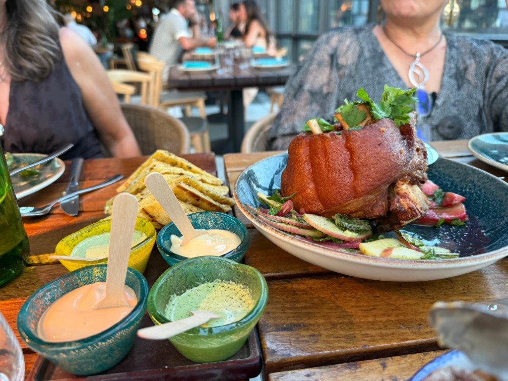 As bites were sampled, there were audible moans. This food was exceptional. Flavors were balanced, taste buds tingled and contented sighs were heard around the table. Unlike the 7-top of young women near us who were there, it seemed, just for the ‘gram, we were there to dine and that we did. In fact, our attention was so devoted to the plates on our table, that I didn’t even bother to look for a skyline photo opportunity. My only picture from the meal that wasn’t food, is the quick shot I took of the night sky above our heads, which I used for this post.