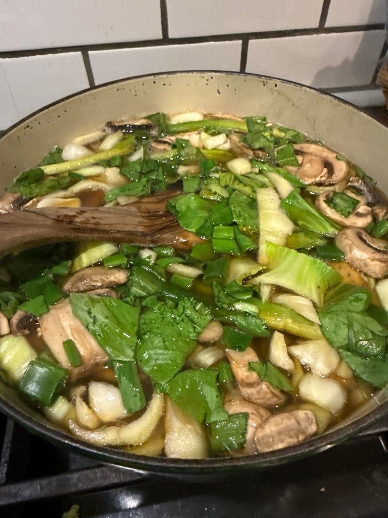 An Asian riffed soup with baby bok choy, mushrooms, scallions and chicken meatballs.