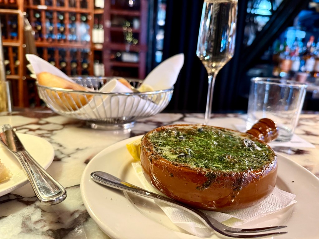 Midafternoon as I was starting to feel a bit peckish, I walked past Mondavie and paused to check out the menu. We would be eating an early dinner, but a light snack seemed to be in order… Escargot and a glass of Cremant at the bar made for an ideal and excellent nosh. As I assessed the dining rooms to either side of me, I saw that flutes of sparkling wine graced nearly every table. I was in good company and would be interested in getting back here in the future for a more substantial meal, perhaps at a time when they featured live music.