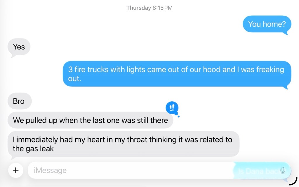 I texted a neighborhood and was somewhat relieved when she responded to say that it seemed the trucks were next to my house, not at it. I texted my son, who had come home to see the trucks, lights flashing but sirens off, on our small street.