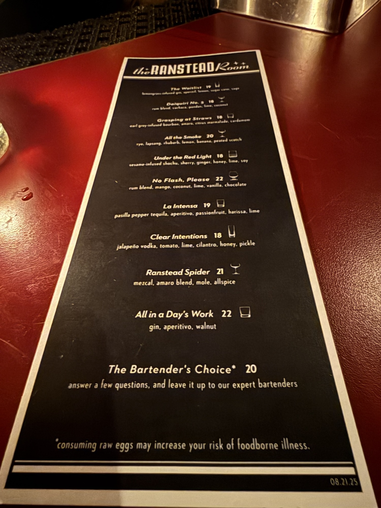 By this point in the evening, one of us had had enough and was ready to head back to the hotel, while I wanted to check out a speakeasy I had read about. We grabbed a rideshare that brought me to The Ranstead Room before continuing to the hotel for a second drop off.