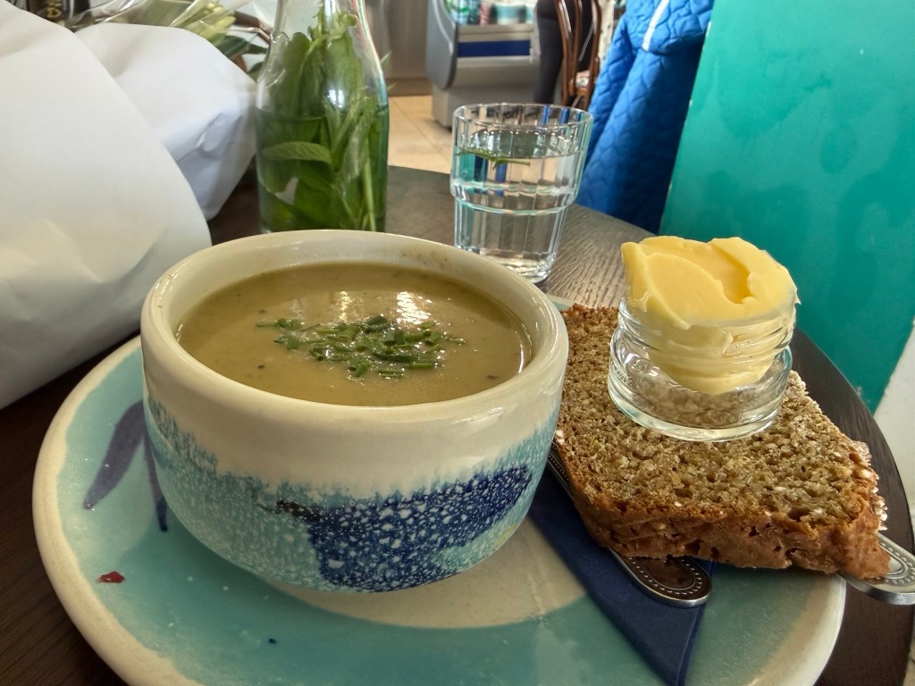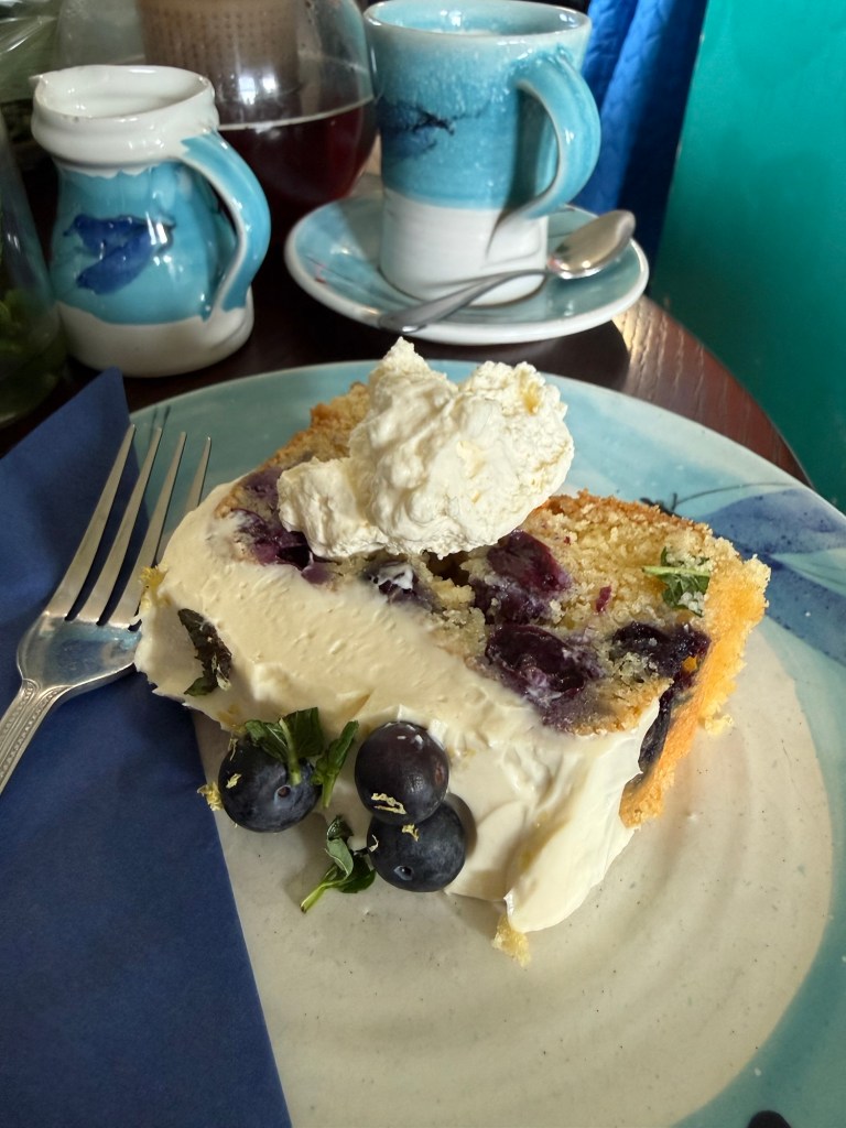 Generous cone of blossoms in hand, I stopped in at the tea room for a warm up of a bowl of hearty soup and a delicious slice of cake topped with blueberries, cream cheese frosting and lemon zest. With a pot of tea, of course.